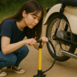 携帯電動空気入れが便利ですが、中華製なので耐久性が悪そうです。パナソニックのパナレーサーの空気入れは手動で小さいですが、カブならこれで入れられます。