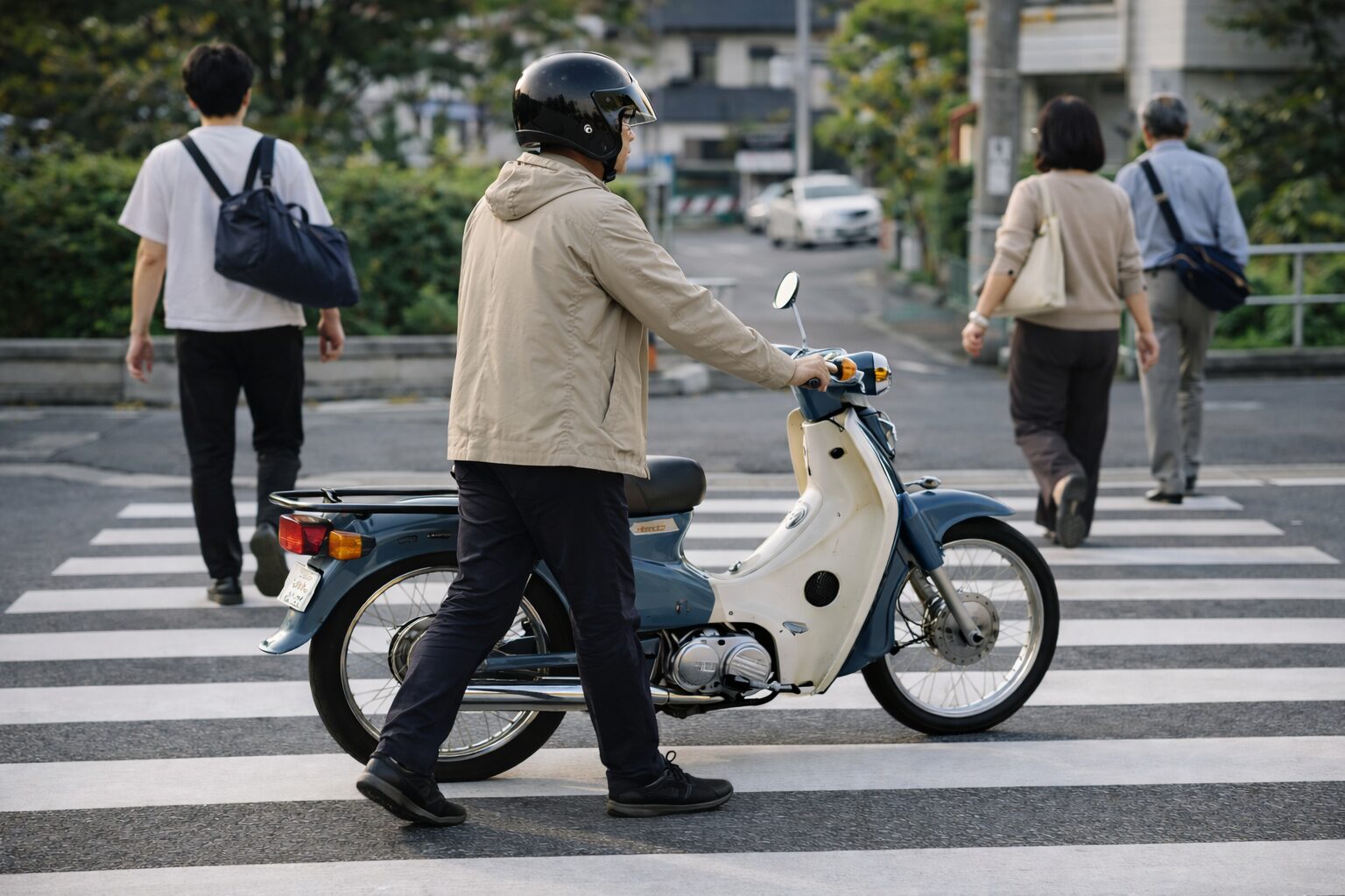 渋滞で動かない時や道を間違えた時でも、スーパーカブならエンジンを切って押し歩きで向きを変えることができます。