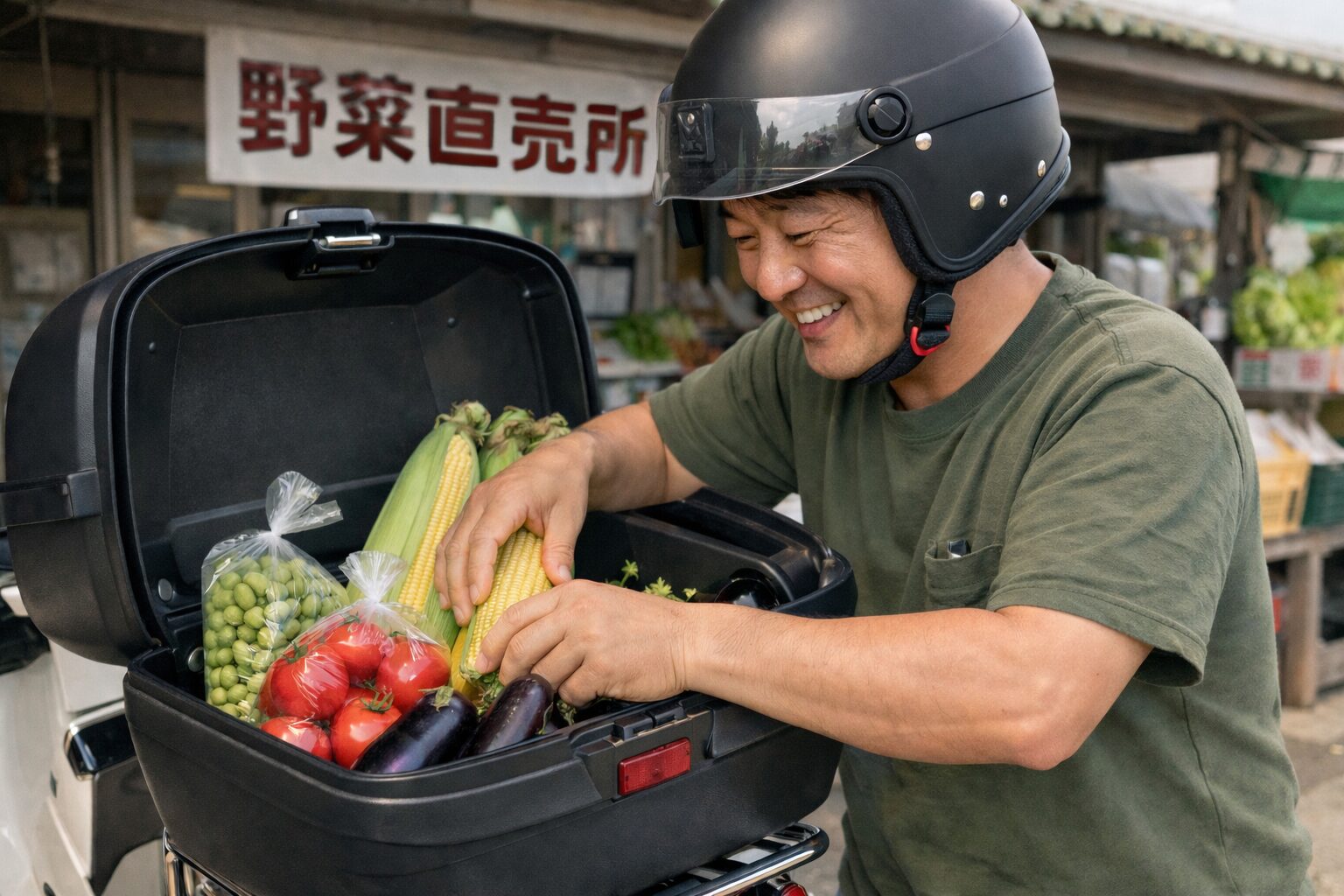 車だと停められないような狭い直売所も、カブなら問題なし。